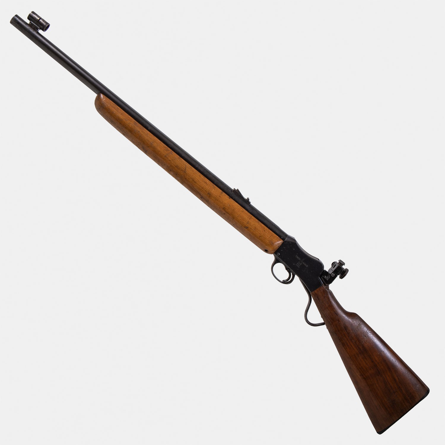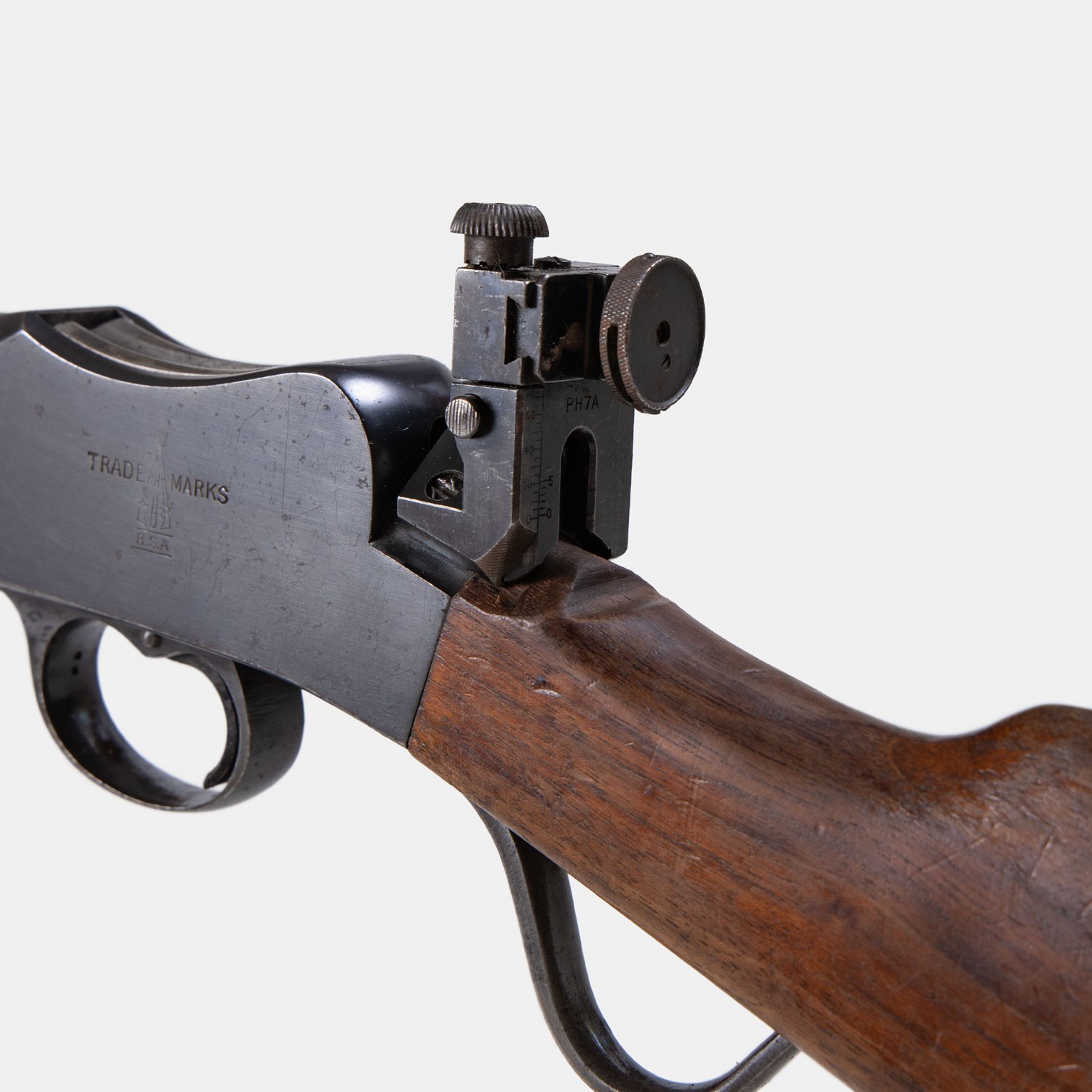 Carabine BSA & Co. Martini Cal. 22 LR, finition 85% bronzée avec légères traces d’oxydation, plaque de couche BSA d’origine, mécanisme irréprochable, canon rayures régulières, bague près de la bouche.