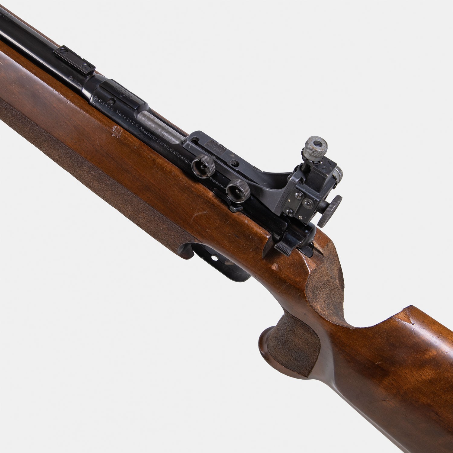 Anschutz Match 54 Cal. .22 LR (1971) état très bon, bronzage 100%, crosse soignée. Canon lourd miroir, complète avec dioptre. Arme de précision idéale tir sportif.