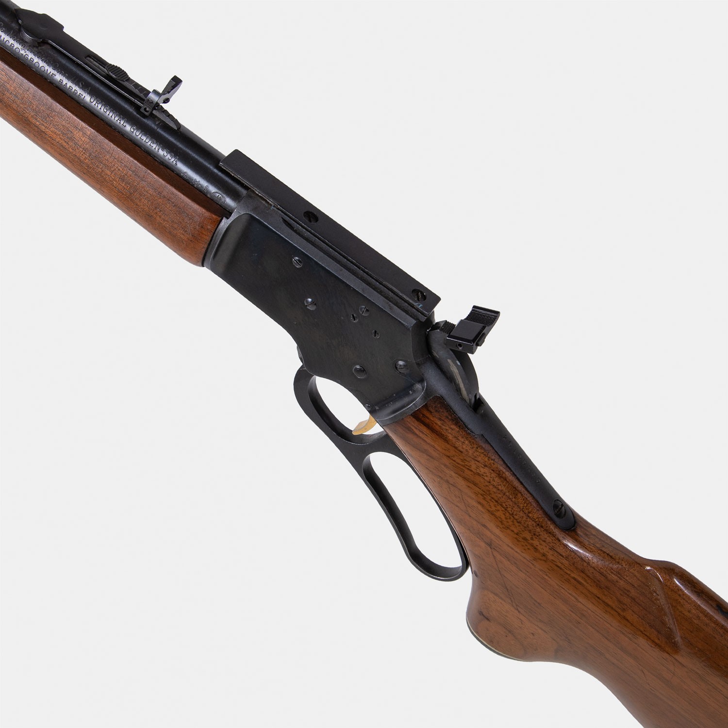 Carabine Marlin Mod. Golden 39A (1974) Cal .22 LR en excellent état, bronzage 98%. Canon JM Micro-Groove fileté 1/2x20. Crosse noyer propre. Carabine levier sous garde mythique.