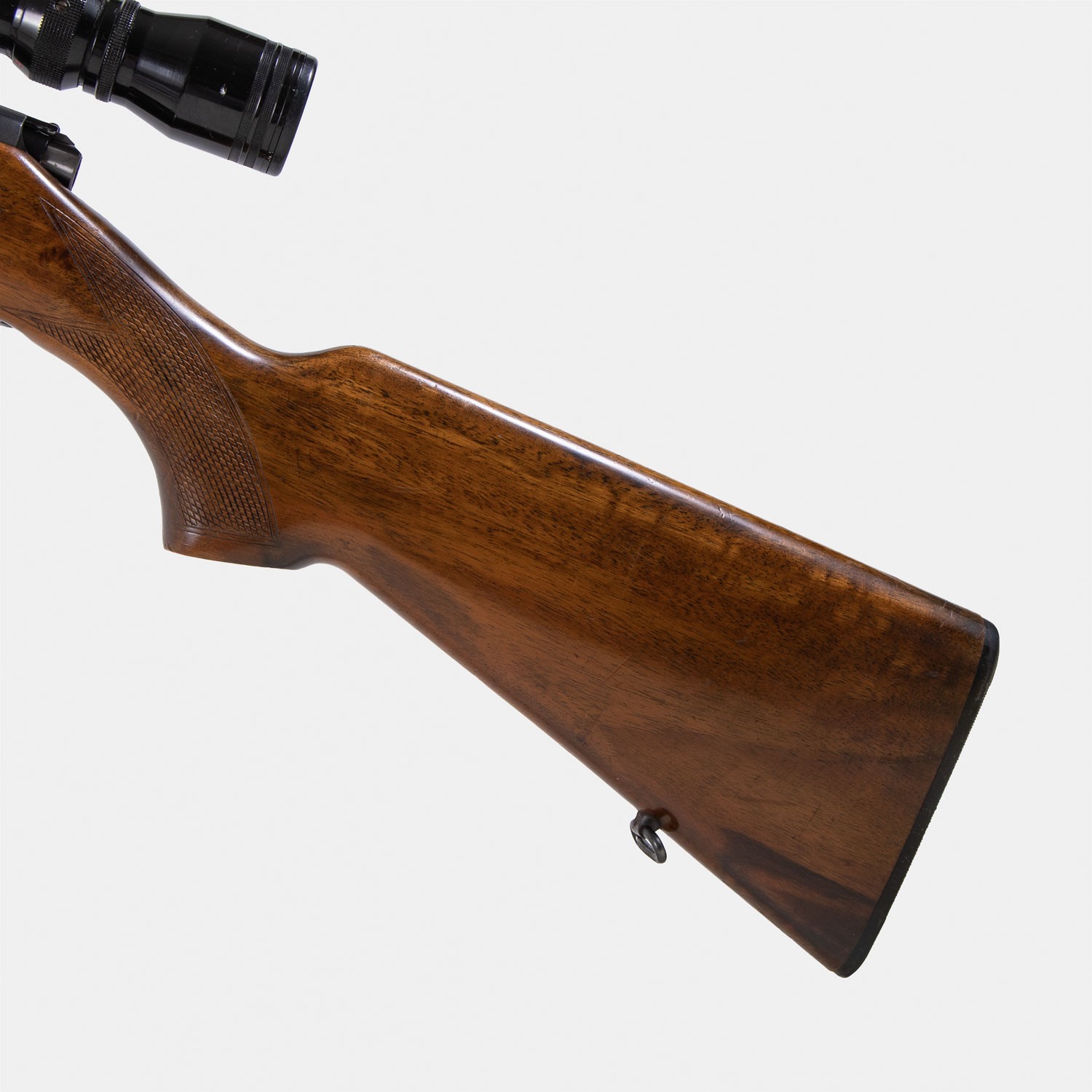 Carabine .22 LR BRNO Modèle 2 (1978). Canon de 61 cm fileté (1/2x20 UNF) avec rayures spécifiques type "Micro-groove" (16 rayures). Équipée d'une lunette vintage Deerfield 3-9x40 sur colliers CZ en acier. Mécanique fluide et saine. Hausse d'origine manquante, guidon présent. Un classique fiable pour le tir.