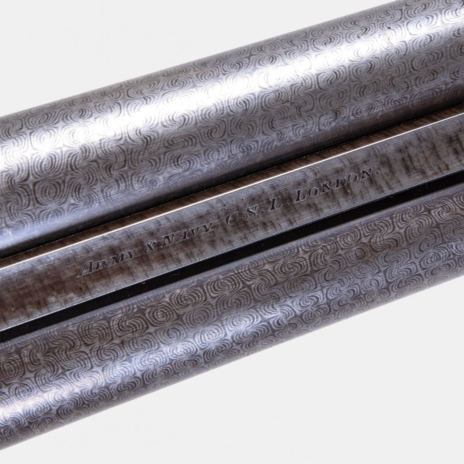 Army & Navy C.S.L 1898 (Catégorie D). Canons Damas épreuve Poudre Vive. Inclus valise Motor Case d'époque. Bascule festonnée Anson. Crosse 38cm. Mécanique serrée, canons sains.
