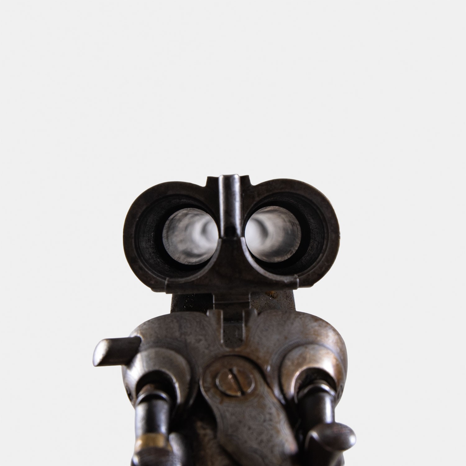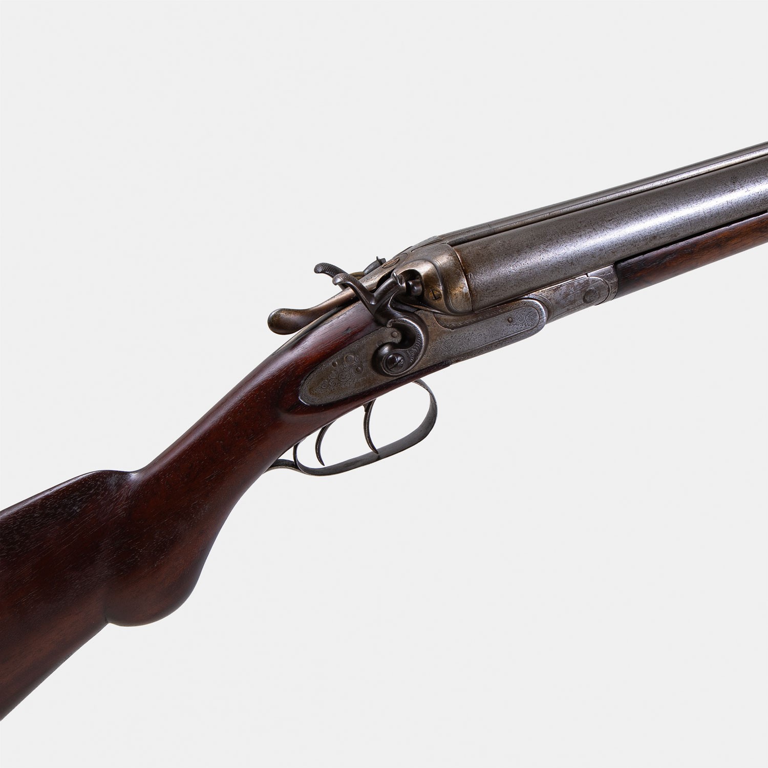 Fusil à Chiens Artisan Anglais Cal. 12. Classé Catégorie D (Vente libre). État général médiocre : mécanique à réviser (ressort de clé manquant, jeu à la fermeture) et canons piqués. Pour collection ou restauration.