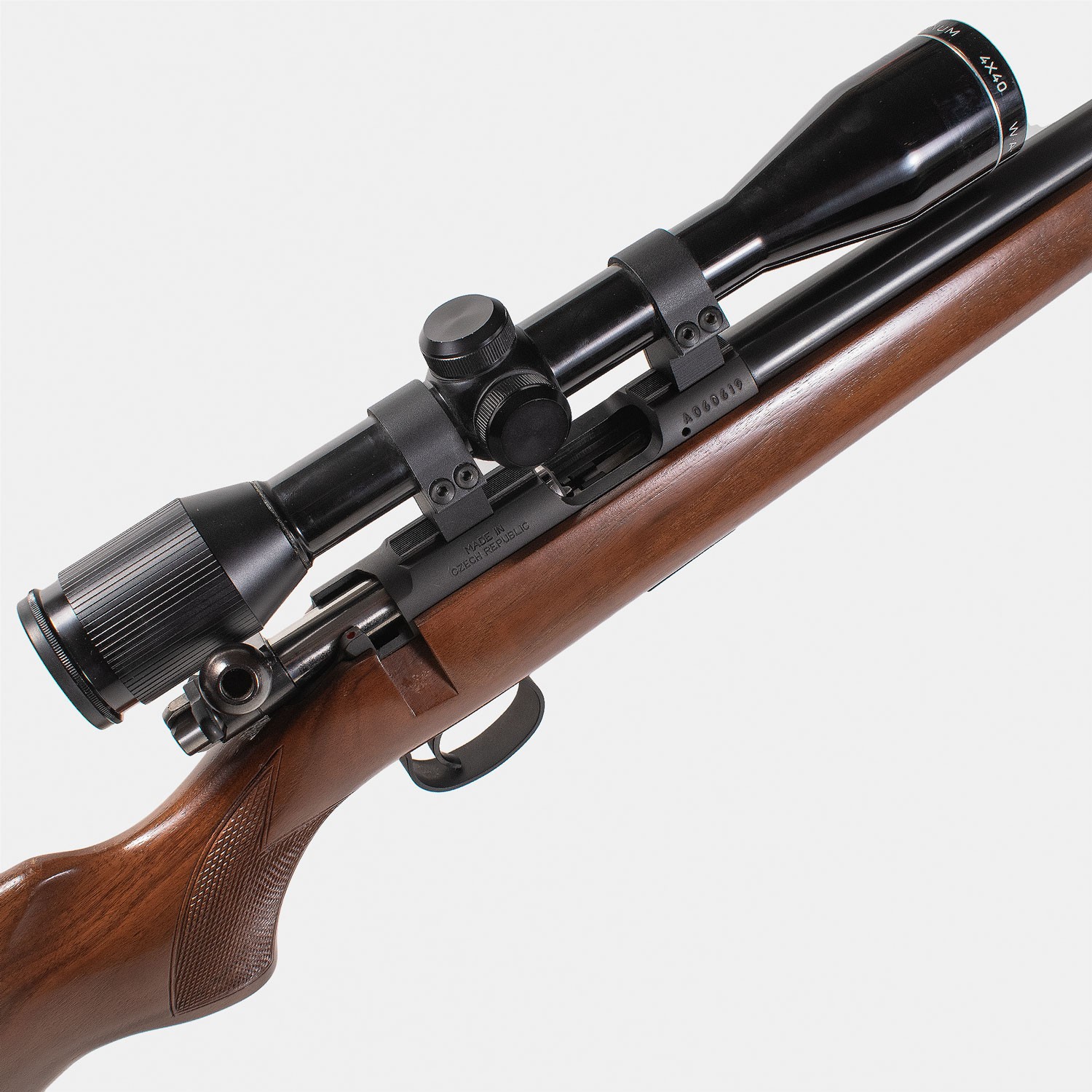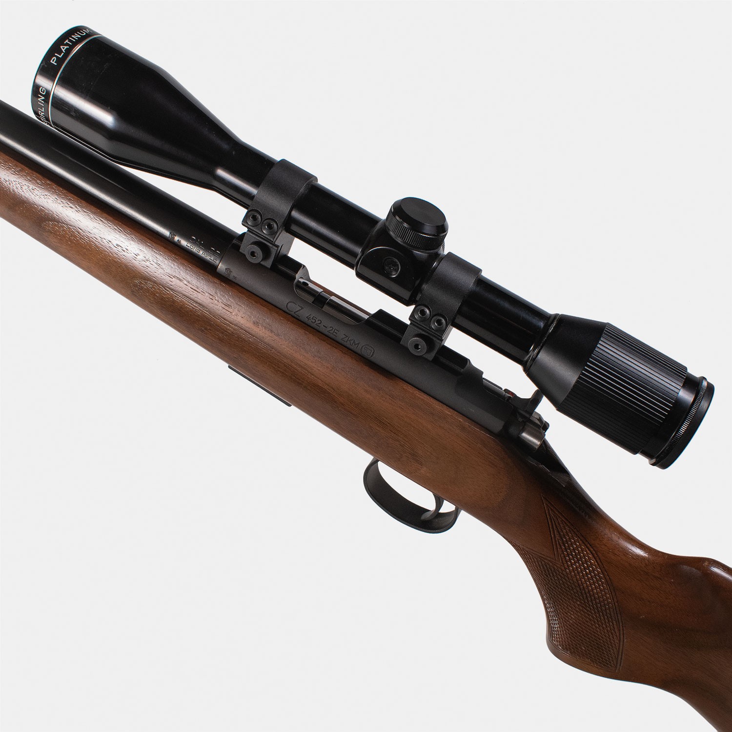 Carabine CZ 452 2E ZKM Cal. 22LR : En excellent état général, très peu utilisée, équipée d’une lunette 4x40, canon semi-lourd fileté de 52 cm en parfait état. Vendue avec mallette.