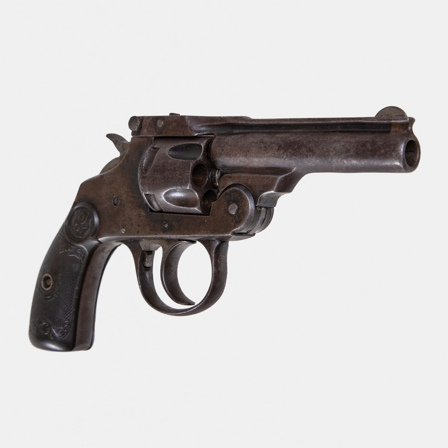 Revolver Iver Johnson Top Break Cal. 32 S&W, bon état général, patine homogène, crosse réparée proprement, mécanisme fonctionnel, canon usé avec léger gonflement.