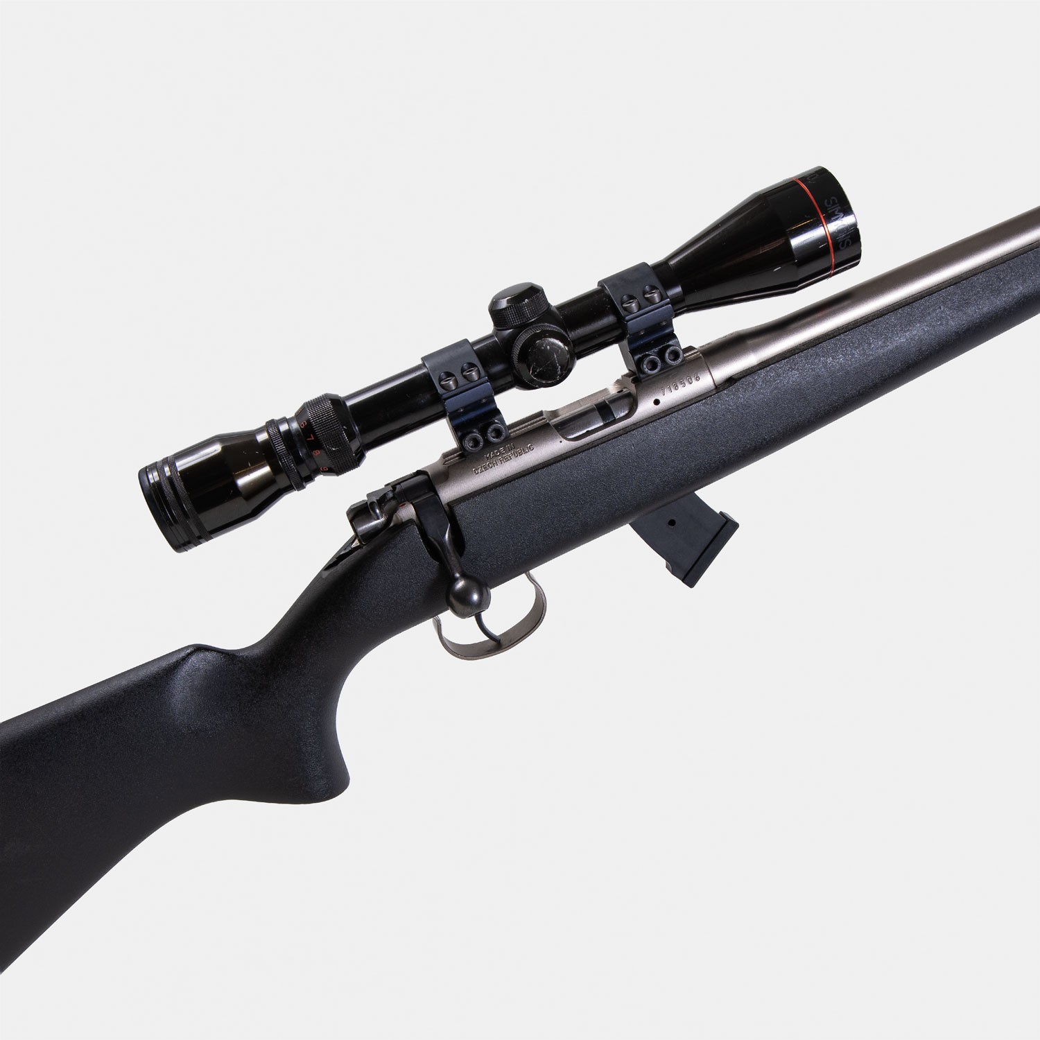 Carabine CZ 452 2E ZKM Cal .22 LR (1999). Canon de 52 cm fileté (1/2x20 UNF) avec modérateur de son. Équipée d'une lunette Simmons 3-9x40 et d'un magasin de 10 coups. Monture synthétique propre et mécanique fluide. Un ensemble complet, entretenu et prêt pour le pas de tir.